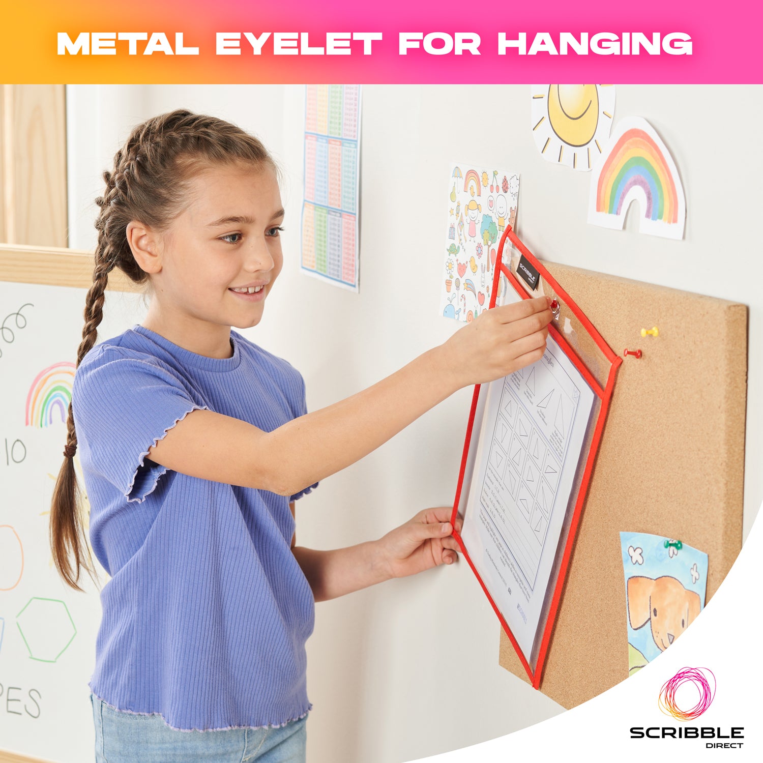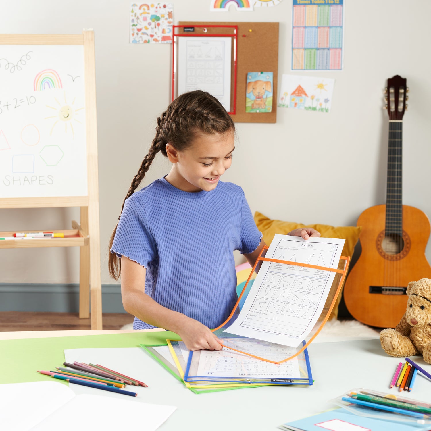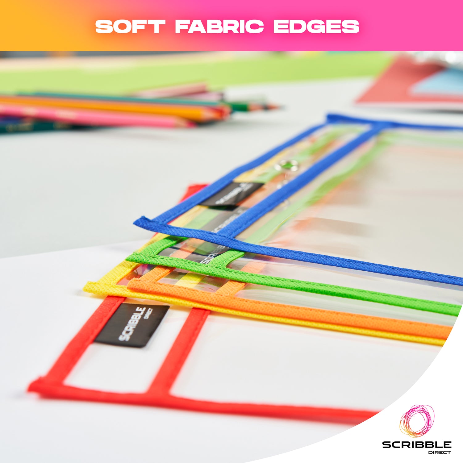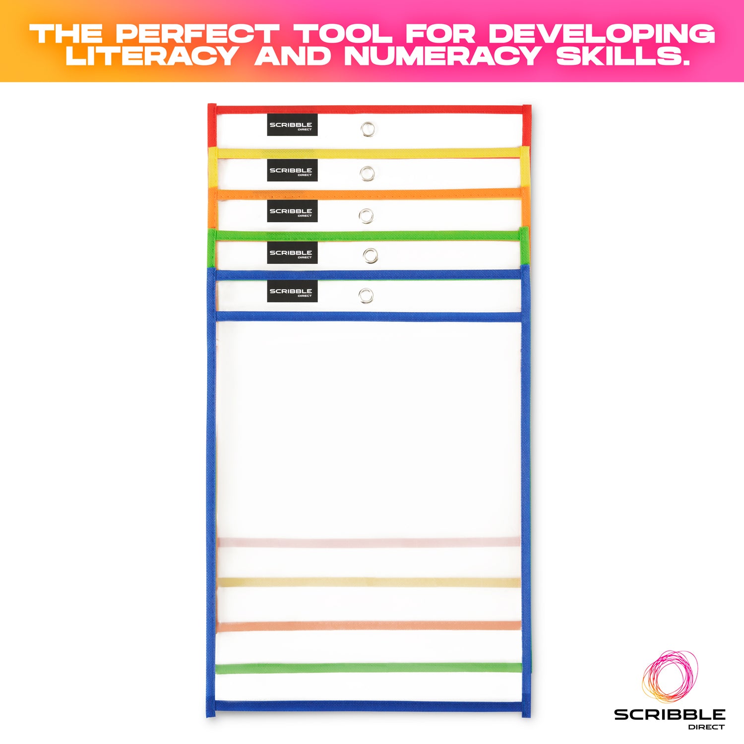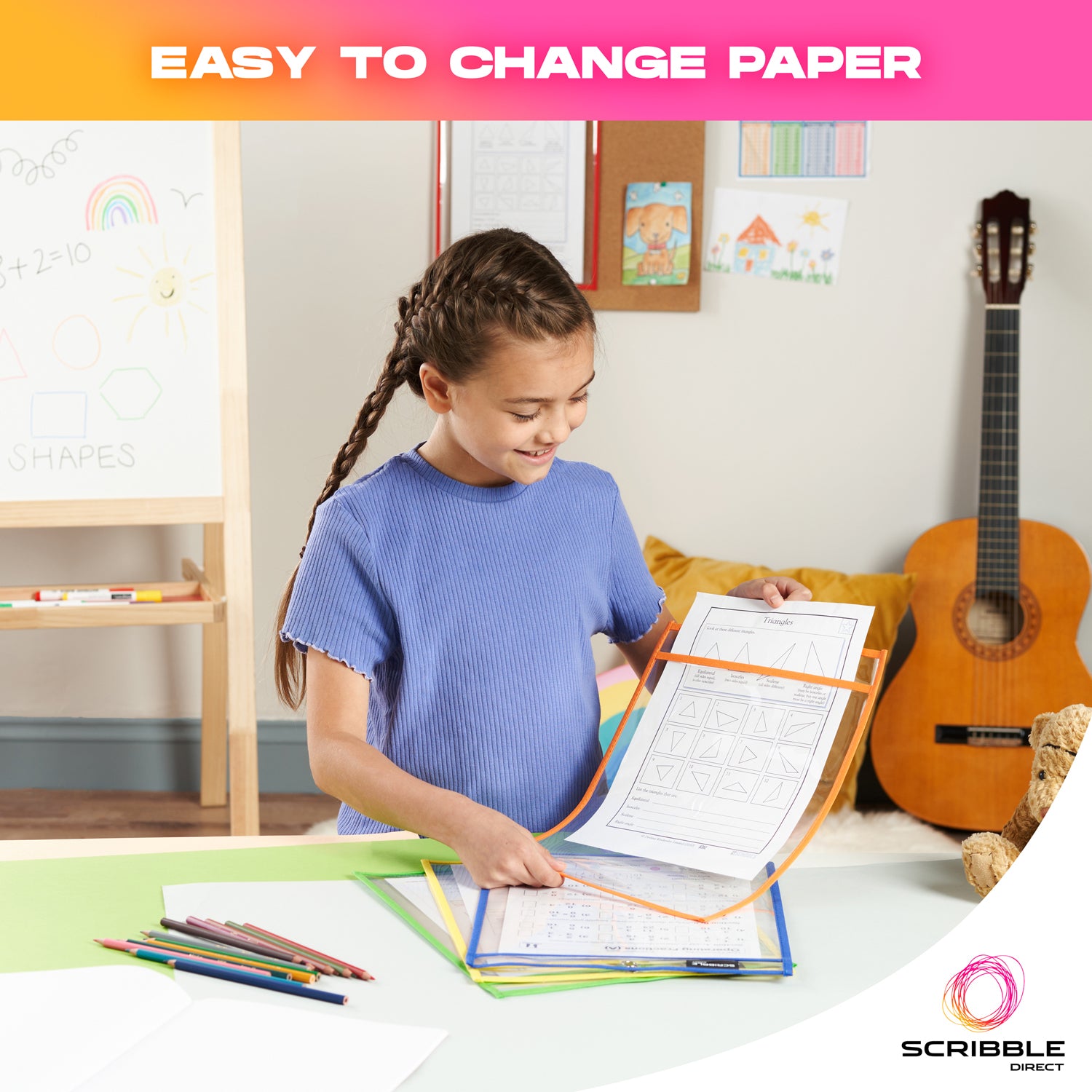 🌿【Bright Colours】- Each pack of Ten Scribble dry erase pockets includes two each of Red, Orange, Yellow, Blue, and Green reusable dry erase pockets.