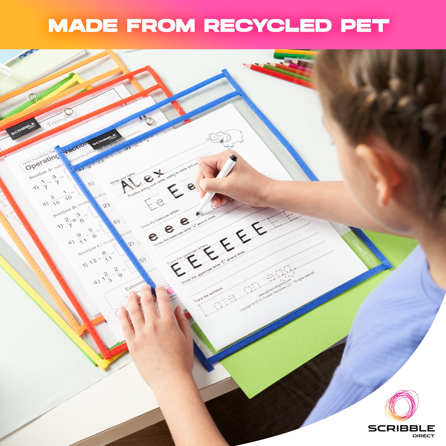 🌿【Versatile】- Scribble A4 dry erase pocket sleeves are perfect for reusing worksheets and for write-on wipe-off learning activities in the classroom or at home. Our heavy duty write & wipe pockets can also be used as sheet protectors for important documents in the workplace.